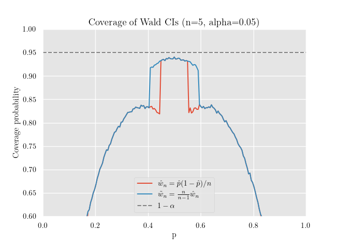 - 離散母数問題でのWald区間は, 被覆確率を名目値に一致させるには十分な標本数が必要となる.
