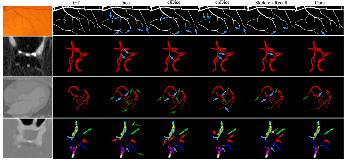 これらの構造では, 予測結果が断続的になる課題 がしばしば発生していました. 既存研究の clDice や Skelton Recall などは枝レベルの連続性を評価できますがピクセル単位の局所的不連続には弱いという限界があります. そこでこの研究では, グローバル(枝レベル)とローカル(ピクセルレベル)の両方の情報を統合したフレームワーク を開発しています.