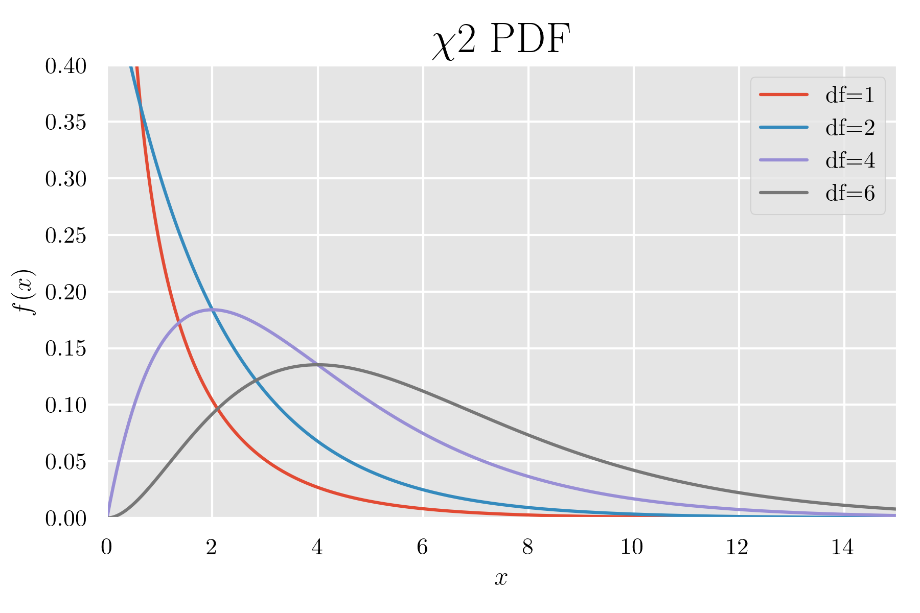カイ二乗分布の確率密度関数は定義域が0以上で 自由度が大きくなるにつれて山が右にシフト していきます.