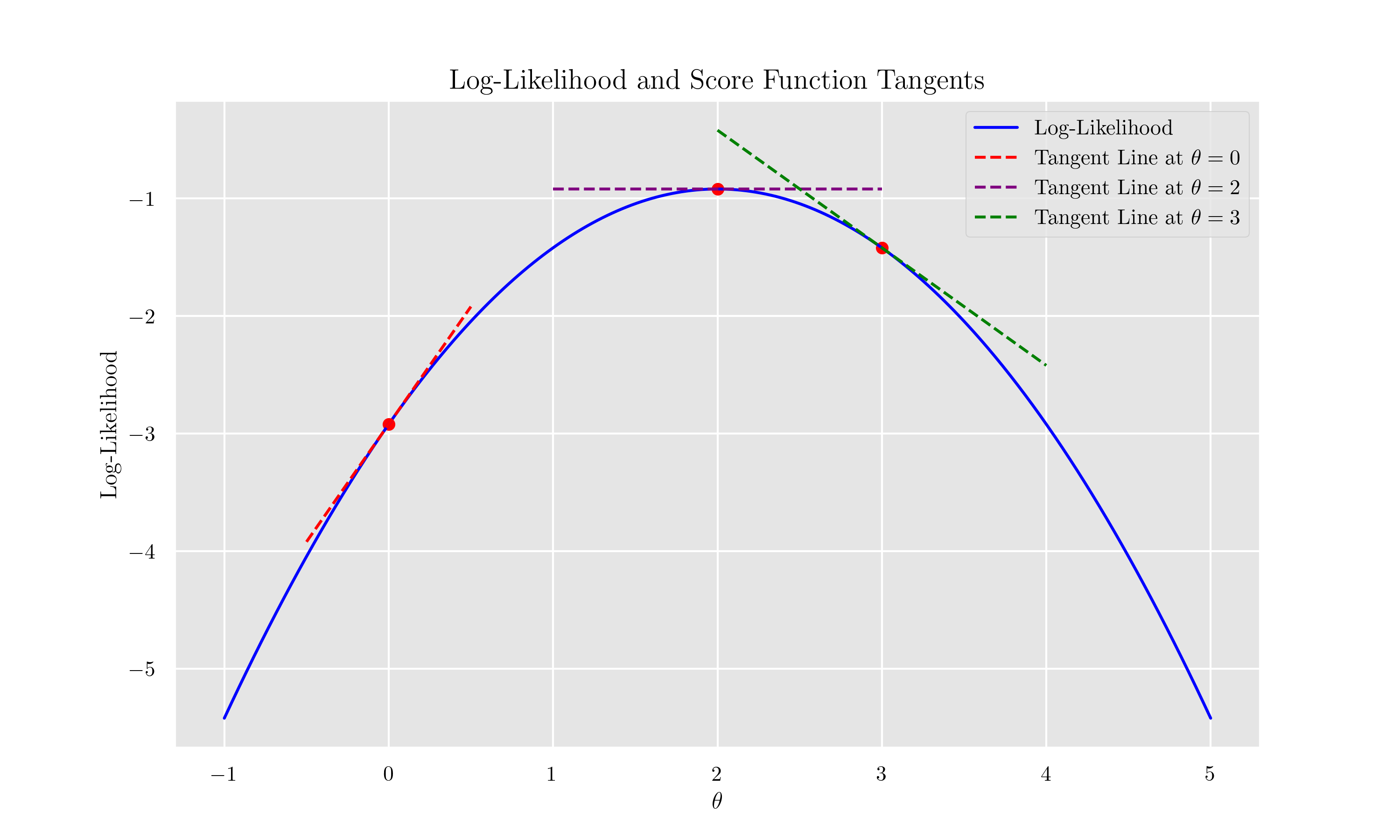 スコア関数は対数尤度関数の勾配(傾き) を表しています. スコア関数は対数尤度の傾きを表すので、